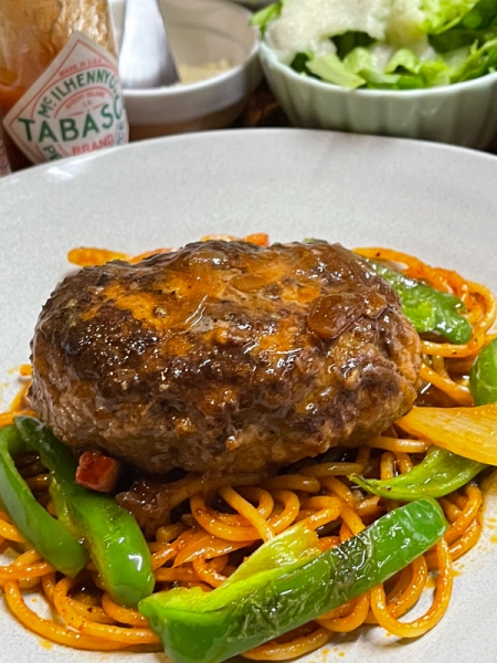 その名のとおりスパゲッティのナポリタンの上にハンバーグを乗せたやつ。